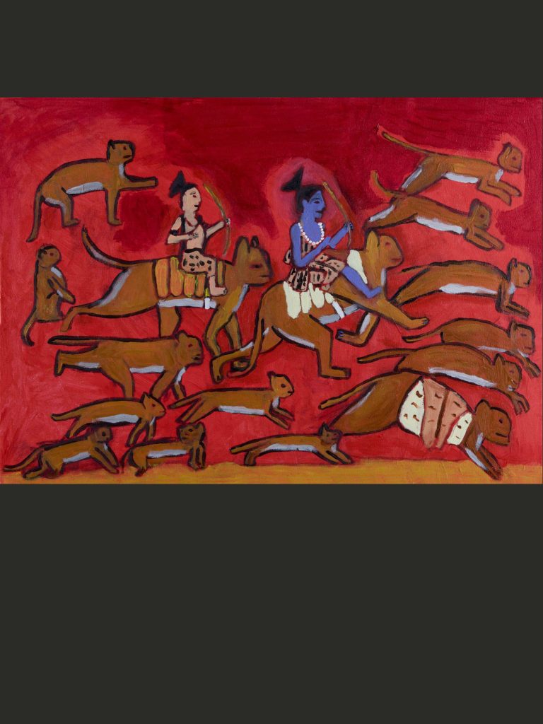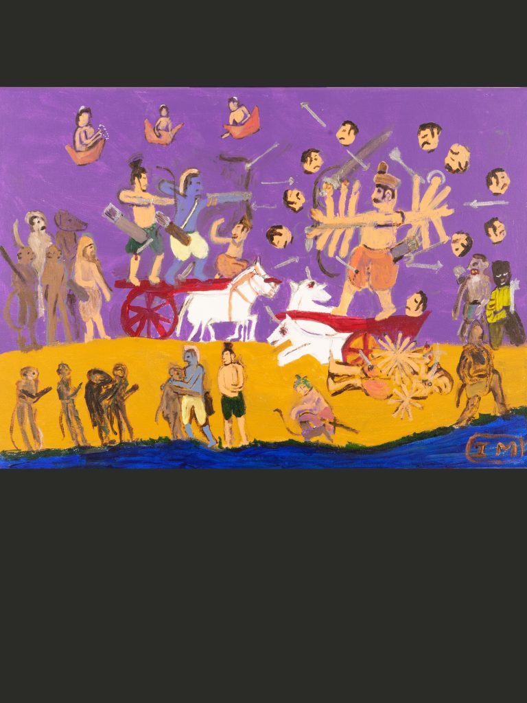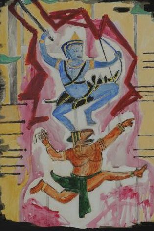 Deze schilderijen vertellen het verhaal van Rama, de ideale man. Zijn vrouw Sita wordt ontvoerd door de demon Ravana. Met de hulp van zijn vriend de Aapgod Hanuman en een apenleger weet Rama de demon te verslaan en zijn vrouw te bevrijden. Rama werd koning.